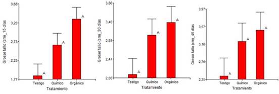 En la Figura 1 se presenta los resultados del grosor del tallo a los 15, 30 y 45 d as. En todos los casos se observa que valor m s alto se obtiene con el tratamiento org nico, mientras que el valor m s bajo se obtuvo con el tratamiento testigo. Sin embargo, al realizar el an lisis de varianza se obtuvo que el efecto de los tratamientos no es significativo (p>0,05), por lo que se concluye que todos los tratamientos producen el mismo grosor del tallo. Adem s, se obtuvo que el efecto de los bloques no es significativo (p>0,05), por lo que se concluye que el tipo de suelo no afecta a la variable dependiente.