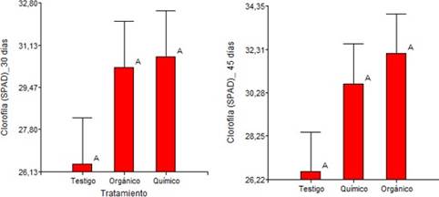 Figura 3: Muestra los contenidos de clorofila a los 30 y 45 d as. En todos los casos, el tratamiento org nico presenta el valor m s alto de clorofila, mientras que el tratamiento testigo registra el valor m s bajo. No obstante, el an lisis de varianza no evidenci un efecto significativo de los tratamientos sobre la concentraci n de clorofila (p > 0,05). Por lo tanto, se concluye que no existen diferencias significativas en el contenido de clorofila entre los diferentes tratamientos. Adem s, el an lisis no mostr un efecto significativo de los bloques (p > 0,05), lo que indica que el tipo de suelo no afecta la variable dependiente.